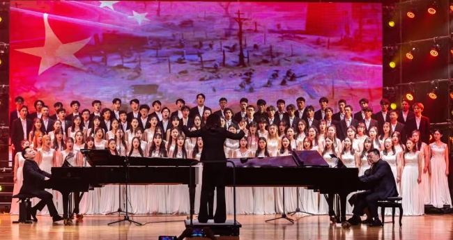 由何應(yīng)聰老師執(zhí)棒、音樂(lè)教育學(xué)院副院長(zhǎng)盧格霖和余捷老師擔(dān)任雙鋼琴演奏壓軸曲目《黃河頌》和雙鋼琴與合唱《保衛(wèi)黃河》,再現(xiàn)了抗日戰(zhàn)爭(zhēng)時(shí)期中華兒女眾志成城、英勇戰(zhàn)斗的壯麗場(chǎng)景,表達(dá)了奪取勝利的激情與必勝的樂(lè)觀主義情懷。讓觀眾在音樂(lè)的魅力中尋找民族復(fù)興的力量源泉,感受藝術(shù)與信仰的魅力。