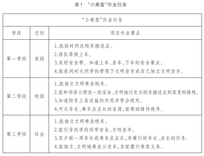 以“小乘客”作業(yè)任務(wù)為例:山村學(xué)生散居于各個村岕,上下學(xué)需要校車接送?!?/span>小乘客”體驗項目充分發(fā)揮學(xué)生自我教育的優(yōu)勢,讓學(xué)生自覺進(jìn)行自我認(rèn)識、自我督促、自我克制、自我改正,從而形成良好的公共秩序素養(yǎng)。(“小乘客”作業(yè)任務(wù)見表1)