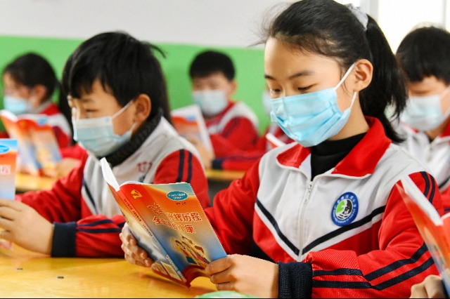 河北省邯鄲市廣平縣濱河小學(xué)學(xué)生在“三分鐘黨史微課堂”上閱讀黨史讀本。程學(xué)虎 攝