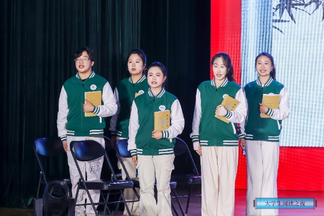 “大學(xué)生閱讀之夜”分四個篇章,包括閱讀文化:從根脈到繁茂;閱讀人生:從細流到江海;閱讀榜樣:從腳下到高峰;閱讀芳華:從星火到光芒四部分。通過吟誦、演講、話劇表演等形式,展現(xiàn)出高校學(xué)生從讀書中汲取力量、增長見識、傳承文化、走向未來的精神風(fēng)貌。不同高校、不同專業(yè)的大學(xué)生在舞臺上結(jié)合各自院校的專業(yè)特點,依托獨有的學(xué)科特色,緊緊圍繞“閱讀”這一主題,展現(xiàn)新時代新青年在閱讀書籍和從閱讀榜樣身上體悟到的時代重任、勇于開拓、敢于創(chuàng)新的挑戰(zhàn)精神和堅定的文化自信。