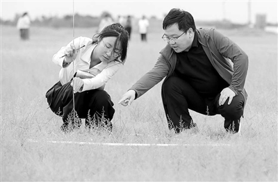 8月21日,陜西省定邊縣白泥井鎮(zhèn)大水村的一片鹽堿地里,西北農(nóng)林科技大學(xué)副研究員李偉正在給張夢(mèng)婕(左)講解植物群落調(diào)查的方法。