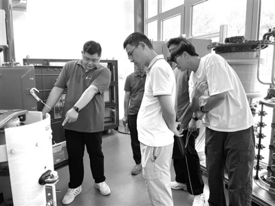 企業(yè)工程師(左一)為南華大學(xué)電氣工程學(xué)院研究團隊現(xiàn)場講解機械原理。 學(xué)校供圖