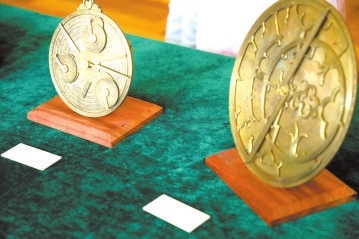 清華大學(xué)科學(xué)博物館志愿者楊明繁正在為記者們講解星盤(pán)。