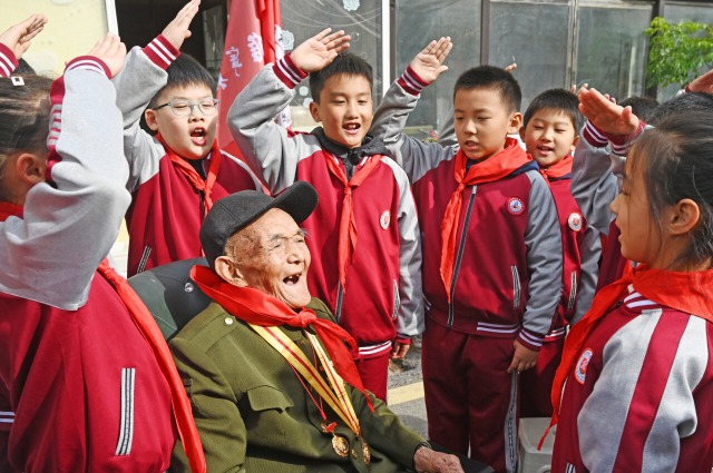 少先隊(duì)員向抗戰(zhàn)老兵馬鳳儉敬隊(duì)禮。通訊員 洪星 攝