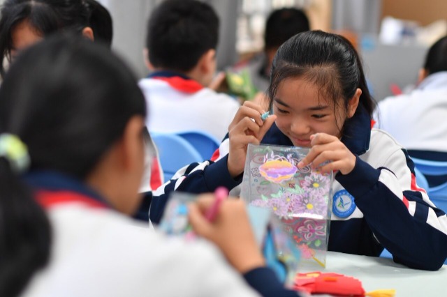 學(xué)生利用廢舊物品制作紙盤畫。通訊員 王海濱 攝