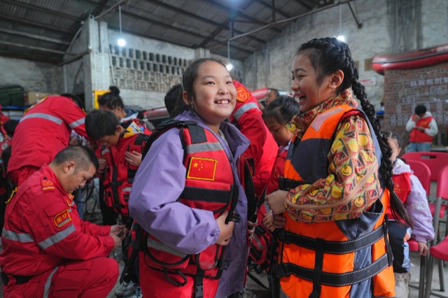 孩子們在學(xué)習(xí)救生衣穿戴方法 秦廷富 攝