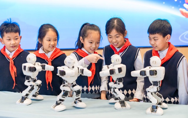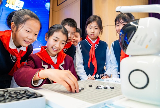 學(xué)生們在校園科技節(jié)上與AI機(jī)器人進(jìn)行棋類對弈。通訊員 翟偉凱 攝