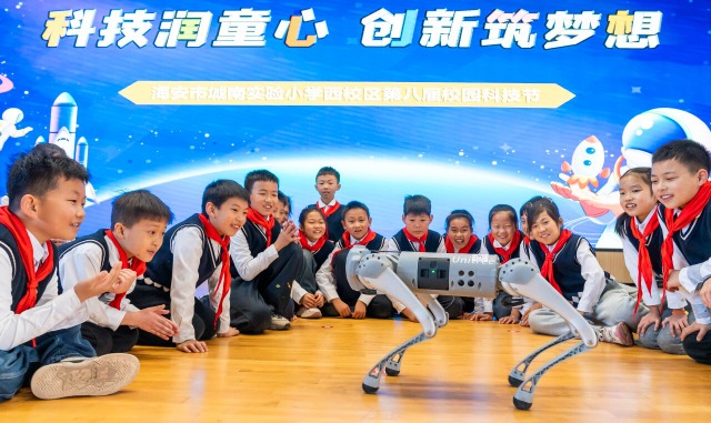 學(xué)生們在校園科技節(jié)上觀看智能機(jī)器狗表演。通訊員 翟偉凱 攝