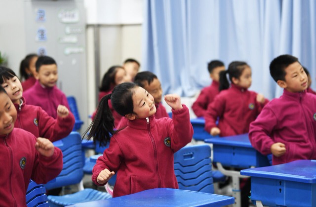 學(xué)生在教室里練習(xí)“課桌舞”。通訊員 趙松 攝