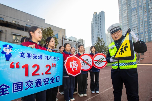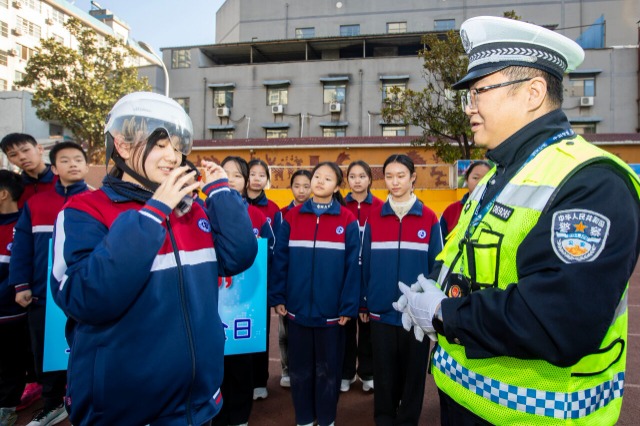 11月28日,湖北省襄陽市諸葛亮中學(xué)開展全國交通安全日主題實踐活動,為同學(xué)們送上一堂干貨滿滿的“交通安全實戰(zhàn)課”。活動現(xiàn)場,民警通過交通手勢現(xiàn)場教學(xué)、安全頭盔規(guī)范佩戴實操、交通標識趣味識別、汽車盲區(qū)實景認知等形式,打破傳統(tǒng)宣講模式,讓同學(xué)們在互動參與中直觀掌握交通安全知識,切實提升交通安全素養(yǎng),筑牢青少年出行安全防線。中國教育報-中國教育新聞網(wǎng)通訊員 李旭暉 攝