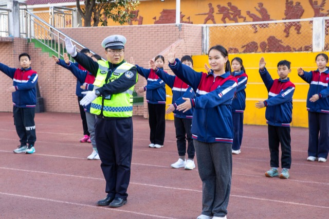 民警正在教學(xué)生們交通安全手勢。通訊員 李旭暉 攝