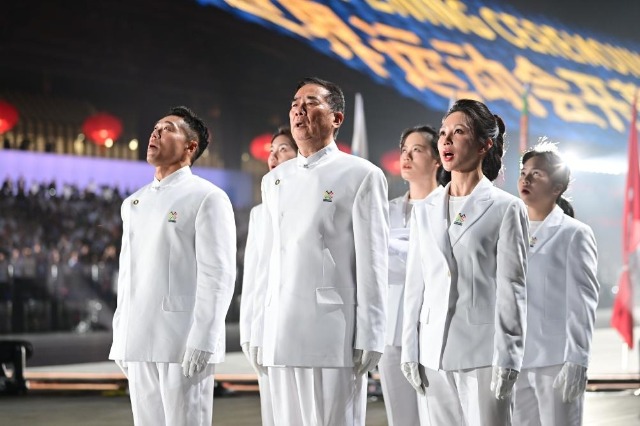 8月7日,孫志安(左三)、劉清漪(右一)和其他國際世界運動會協(xié)會會旗執(zhí)旗手在開幕式上唱國歌。新華社記者 江漢 攝