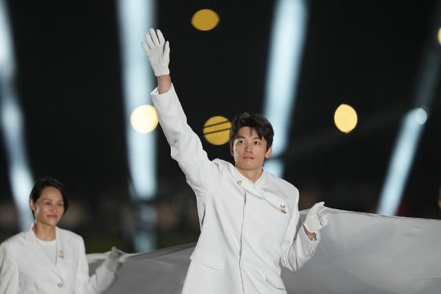 8月7日,國際奧林匹克委員會會旗執(zhí)旗手潘展樂在開幕式上。新華社記者 劉坤 攝