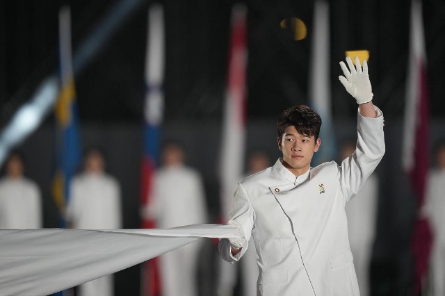 8月7日,成都世運會組委會會旗執(zhí)旗手張雨霏在開幕式上。新華社記者 劉坤 攝