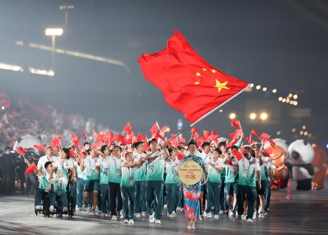 女子輪滑運(yùn)動(dòng)員郭丹和男子技巧運(yùn)動(dòng)員史經(jīng)緯執(zhí)旗,中國(guó)代表團(tuán)步入會(huì)場(chǎng),489人的規(guī)模創(chuàng)歷屆之最,其中包括10名殘疾人運(yùn)動(dòng)員。這也是中國(guó)隊(duì)歷史上首次派出殘疾人運(yùn)動(dòng)員參賽。