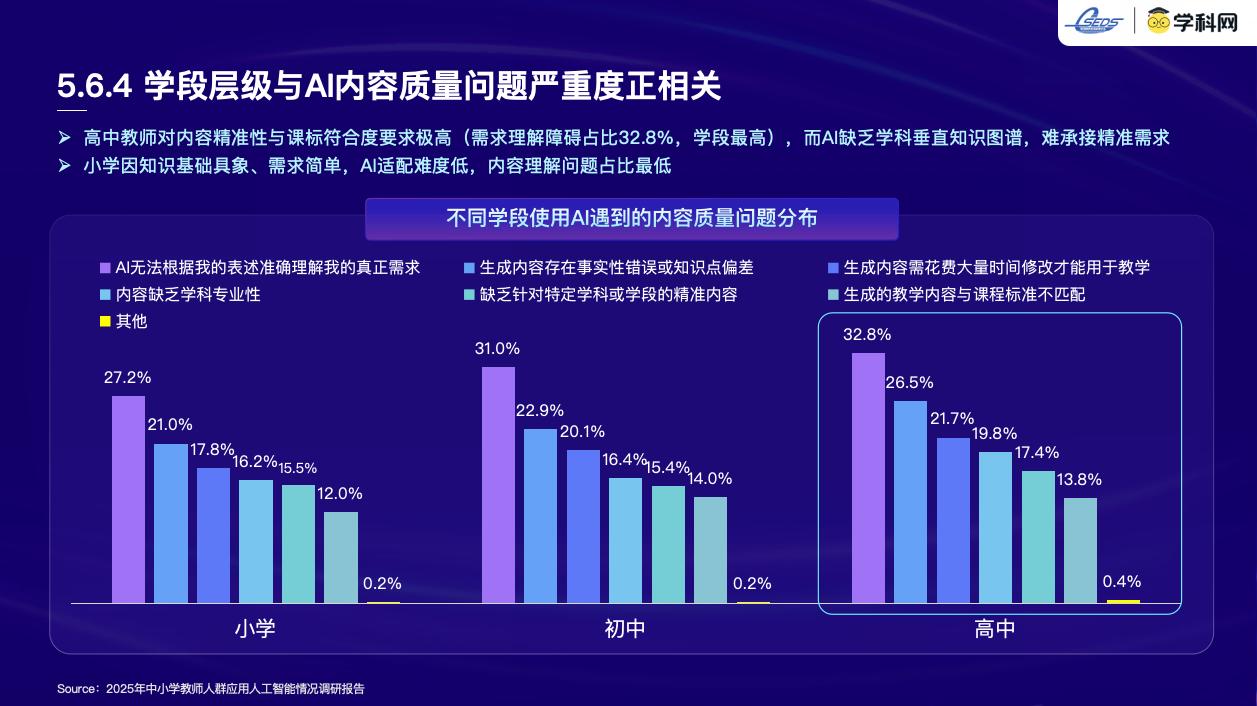 報告顯示,教師對于人工智能的應(yīng)用在學(xué)段上差異明顯,小學(xué)教師應(yīng)用場景以基礎(chǔ)教學(xué)資源獲取為主;初中教師的應(yīng)用則逐漸向應(yīng)試需求傾斜,出題組卷類工具的使用需求增加;高中教師對生成內(nèi)容的精準(zhǔn)度要求最為嚴(yán)格,對內(nèi)容專業(yè)性與準(zhǔn)確性的期待更高。
