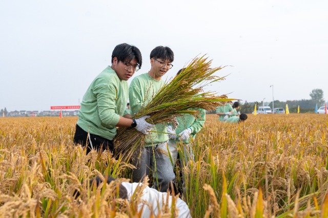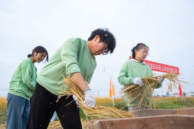 54名青年學子組成9支隊伍,在金色的稻田里展開了一場激烈的水稻收割比拼。比賽分為“收割”和“脫?!眱蓚€環(huán)節(jié),既考驗隊員們使用傳統(tǒng)農(nóng)具的熟練程度和團隊協(xié)作的默契度,也檢驗他們對“顆粒歸倉”這一勞動品質(zhì)的理解與踐行。經(jīng)過緊張激烈的角逐,“稻滿爭先”隊憑借“零割漏,快準狠”的精湛技藝脫穎而出,勇奪冠軍。