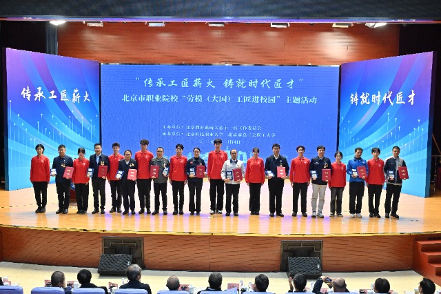 11月4日,北京市職業(yè)院?!皠谀#ù髧?guó))工匠進(jìn)校園”活動(dòng)中,10名北京科技職業(yè)大學(xué)的學(xué)生為10位勞模工匠頒發(fā)“班級(jí)工匠導(dǎo)師”聘書。北京科技職業(yè)大學(xué)供圖