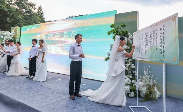 2025年8月20日,在浙江省諸暨市東白湖鎮(zhèn)斯宅村舉行的集體婚禮上,新人在移風易俗倡議上簽名。新華社記者 徐昱 攝
