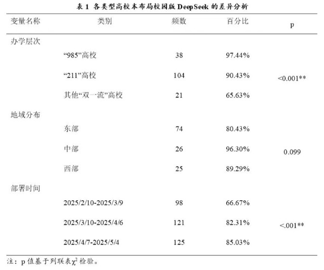 從創(chuàng)新擴(kuò)散的視角來看,DeepSeek在高校層級(jí)與地域?qū)用娴耐茝V過程呈現(xiàn)出典型由上而下的擴(kuò)散路徑,部署態(tài)勢(shì)表現(xiàn)出顯著的層級(jí)化差異。從辦學(xué)層次來看,DeepSeek部署比例隨著高校辦學(xué)層次遞減而逐級(jí)降低。如表1所示,截至2025年5月,全國(guó)“985”高校中已有38所部署DeepSeek,占比高達(dá)97.44%,“211”高校部署率為90.43%,而在非“211”高校但仍屬于“雙一流”建設(shè)高校中,僅有69.63%的高校完成部署,不同辦學(xué)層次的高校在是否部署DeepSeek上有顯著的統(tǒng)計(jì)學(xué)差異(p<0.001)。這一趨勢(shì)表明,辦學(xué)層次較高的高校更易獲得人工智能布局的政策與資源支持,部署節(jié)奏也更為迅速,展現(xiàn)出較強(qiáng)的先行示范效應(yīng)。國(guó)家重點(diǎn)建設(shè)的“985”與“211”高校,通常擁有更充裕的科研經(jīng)費(fèi)與更強(qiáng)的技術(shù)基礎(chǔ)設(shè)施,在校內(nèi)具備較為完善的信息化管理體系,更容易對(duì)接并落地通用大模型。相較之下,部分普通“雙一流”高校在硬件投入、技術(shù)團(tuán)隊(duì)建設(shè)和跨部門協(xié)同方面仍存在短板,使其在部署大模型時(shí)面臨更多的現(xiàn)實(shí)制約。從高校地域來看,部署率在不同區(qū)域間的總體差異并不顯著,但仍呈現(xiàn)出一定的地域分布規(guī)律。地域差異的成因既包括地區(qū)經(jīng)濟(jì)發(fā)展水平、教育信息化建設(shè)程度等客觀因素,也受到地方政策引導(dǎo)、教育行政管理方式與高校間協(xié)作機(jī)制的影響。中部地區(qū)有較強(qiáng)的區(qū)域協(xié)同傳統(tǒng)與高校聯(lián)盟體系,使得新技術(shù)推廣可以通過以點(diǎn)帶面的模式快速擴(kuò)展。相較之下,東部地區(qū)的部署節(jié)奏反而略顯滯后,可能與高校自主性較高有關(guān)。從部署時(shí)間來看,高校大規(guī)模部署DeepSeek的時(shí)間集中在二月中旬到四月上旬,呈現(xiàn)出迅速增長(zhǎng)到逐漸飽和的規(guī)律,“雙一流”高校對(duì)DeepSeek的部署時(shí)間上存在顯著的統(tǒng)計(jì)學(xué)差異(p<0.001)。