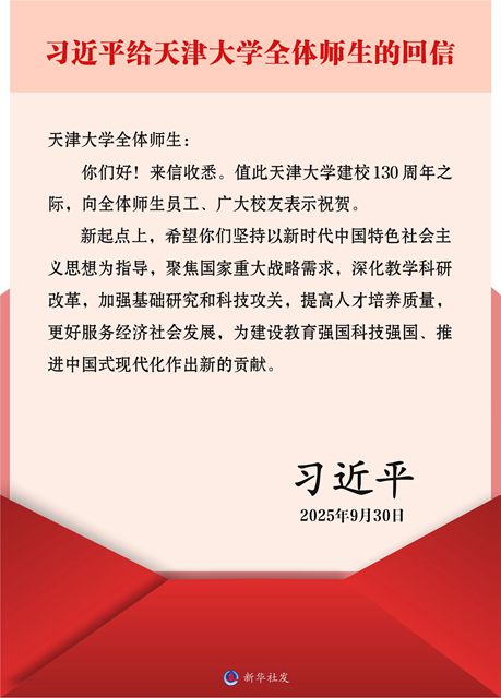 近日,中共中央總書記、國家主席、中央軍委主席習(xí)近平給天津大學(xué)全體師生回信,在天津大學(xué)建校130周年之際,向全體師生員工、廣大校友表示祝賀。
