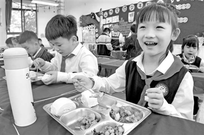 近日,河南省新密市政通路小學(xué)學(xué)生正在享用美味午餐。近年來,該校在做好食品安全監(jiān)管的同時落實校長、教師、家長陪餐制,確保校園食品安全。按照膳食營養(yǎng)搭配,制定科學(xué)的青少年健康食譜,確保青少年吃得安心、吃得健康、吃得科學(xué)。本報記者 單藝偉 攝