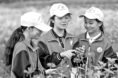 沭陽(yáng)縣懷文小學(xué)學(xué)生在公園中觀察植物的生長(zhǎng)情況,記錄植物的發(fā)芽、開花等過程。胡威 攝