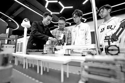 10月29日,鄭棋元(左一)在云南技師學院利用沙盤模型與學生探討研發(fā)項目。