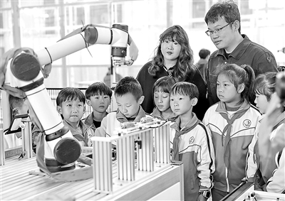 近日,河北省秦皇島市海港區(qū)交建里小學(xué)聯(lián)合燕山大學(xué)工程訓(xùn)練中心舉辦“學(xué)習(xí)科普知識 感受智能制造”活動,讓學(xué)生感受智能制造的魅力和科技發(fā)展成就,培養(yǎng)學(xué)生的科學(xué)精神。圖為工作人員為學(xué)生介紹智能化打標檢測與裝配系統(tǒng)。 曹建雄 攝
