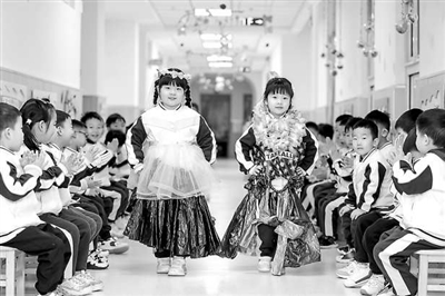近日,山東省青島市李滄區(qū)青峰路幼兒園開(kāi)展“勤儉節(jié)約 變廢為寶”主題活動(dòng),圖為小朋友展示用廢棄物品制作的“環(huán)保時(shí)裝”。 張鷹 攝