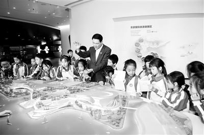 深圳市福田區(qū)東海實(shí)驗(yàn)小學(xué)竹園校區(qū)的學(xué)生走進(jìn)深圳國際生物谷,與南方科技大學(xué)海洋高等研究院院長林間進(jìn)行對(duì)話。福田區(qū)教科院供圖