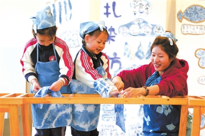 11月19日,四川省樂山市實驗幼兒園至樂分園教師在指導(dǎo)孩子們晾曬自己的扎染作品。世界兒童日(11月20日)來臨之際,該幼兒園開展“樂學(xué)扎染 感受非遺”活動,教師指導(dǎo)孩子們體驗扎染制作技藝,感受中華優(yōu)秀傳統(tǒng)文化的魅力。