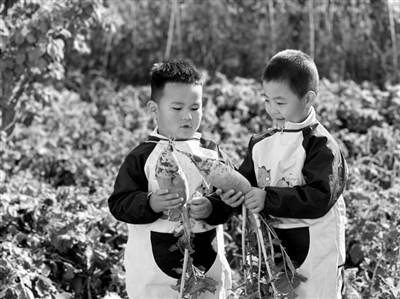 甘肅省張掖市臨澤縣西關(guān)幼兒園的孩子們在拔蘿卜。 資料圖片