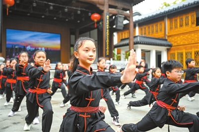 近日,安徽省合肥市廬陽區(qū)雙崗街道虹橋小學學生正在進行傳統(tǒng)武術操展演。趙明 攝