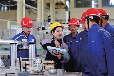 濟(jì)南職業(yè)學(xué)院教師指導(dǎo)學(xué)生開(kāi)展墻壁開(kāi)關(guān)智能柔性生產(chǎn)線調(diào)試實(shí)訓(xùn)。學(xué)校供圖
