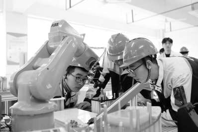 江蘇聯(lián)院常州劉國鈞分院工業(yè)機(jī)器人專業(yè)學(xué)生進(jìn)行安裝調(diào)試實訓(xùn)。本文圖片均為學(xué)校供圖