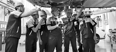 學(xué)生在企業(yè)師傅指導(dǎo)下探究汽車零部件檢測流程。