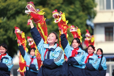 湖北省襄陽(yáng)市樊城區(qū)竹條中心小學(xué)的學(xué)生們?cè)谡n后服務(wù)時(shí)間練習(xí)舞龍。通訊員 聶志鵬 攝
