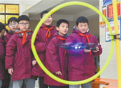 湖南省永州市道縣道州玉潭(東陽(yáng))學(xué)校,學(xué)生們?cè)诶蠋煹闹笇?dǎo)下學(xué)習(xí)無(wú)人機(jī)操作技術(shù)。通訊員 蔣克青 攝