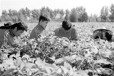 長春職業(yè)技術大學現(xiàn)代農(nóng)業(yè)專業(yè)學生在中科院地理所大豆實驗田實習人工授粉。