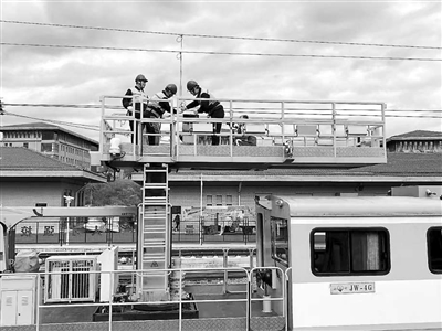 吉林鐵道職業(yè)技術大學鐵道供電技術專業(yè)學生在接觸網(wǎng)檢修作業(yè)車的檢修平臺上進行更換整體吊弦作業(yè)。